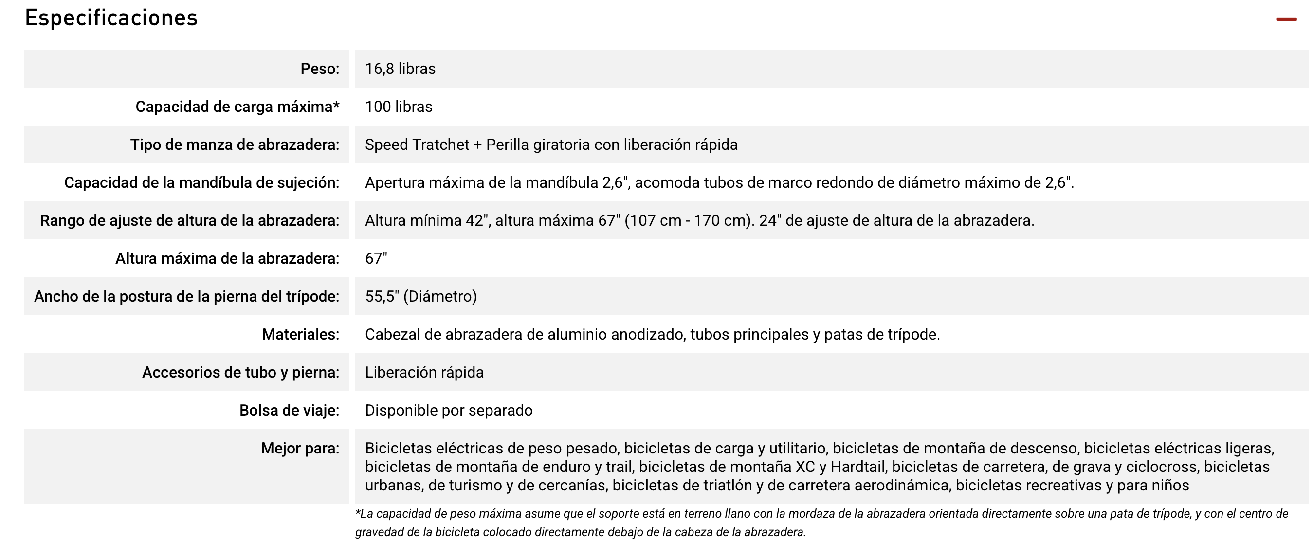 - Optimizado para bicicletas de 31 kilos, para acomodar el servicio en todas las bicicletas de carretera, ciclocross, de montaña y bicicletas eléctricas; capacidad máxima de 45,5 kg (La capacidad de peso máxima asume que el soporte está en terreno llano con la mordaza de la abrazadera orientada directamente sobre una pata de trípode, y con el centro de gravedad de la bicicleta colocado directamente debajo de la cabeza de la abrazadera).