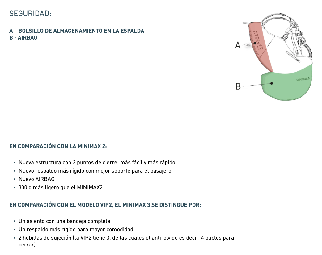Se utiliza un nuevo diseño del respaldo del sillín multicapa para ofrecer una mayor comodidad de vuelo, adaptándose mejor a las diferentes plantillas. En este Minimax 3, la optimización del peso no se ha hecho a expensas de la robustez. El ahorro de peso se explica por la elección de materiales y componentes por parte del equipo de diseño. Un anti-olvido opcional y extraíble está disponible para tener un tercer punto de cierre para el pasajero, si es necesario (para mayor seguridad).